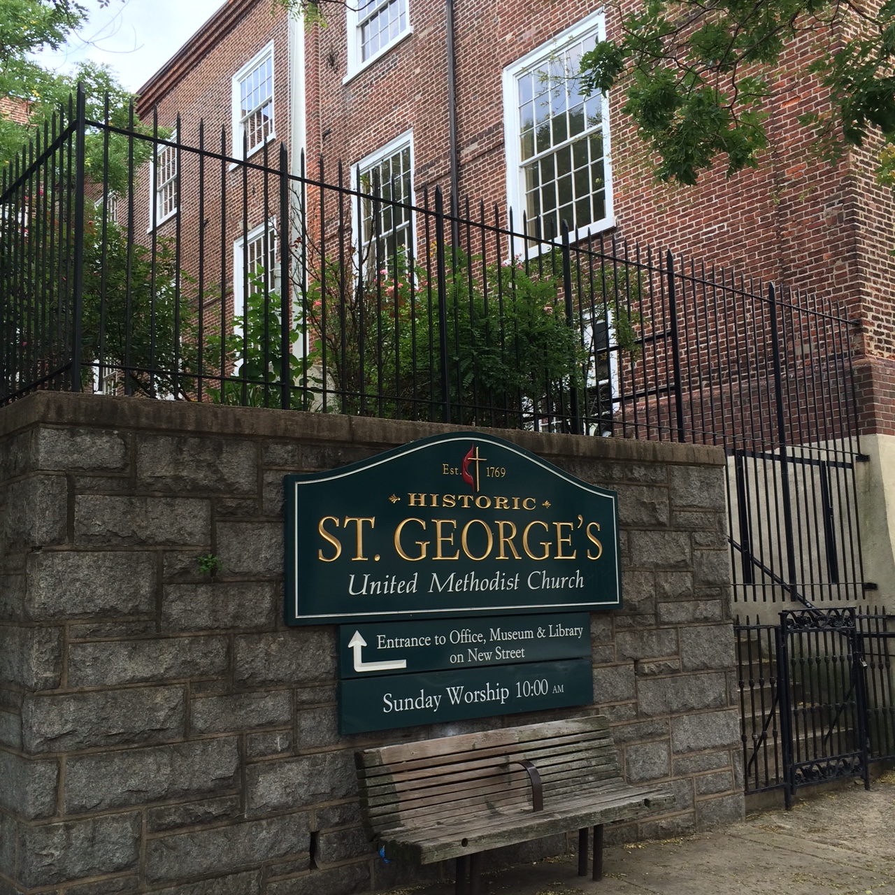 Time was running short on the tour so we took a quick walk past Christ Church and Elfreth’s Alley on our way northward to the corner of 4th and New Streets. In the shadow of the Benjamin Franklin Bridge stand two prominent churches: St. Augustine’s Catholic Church and Old St. George’s United Methodist Church. At this intersection, I told the Catholic pilgrims a story illustrating the limits of religious toleration in the city that Penn founded.